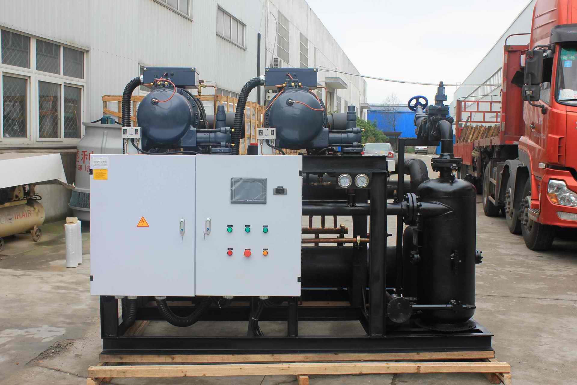 本次為黃山市大自然食品工貿有限公司設計建造的為座-30℃低溫速凍冷庫,冷庫保溫系統(tǒng)采用150MM高密度雙面彩鋼聚氨酯保溫板,制冷機組采用臺灣漢鐘半封閉螺桿制冷機組。