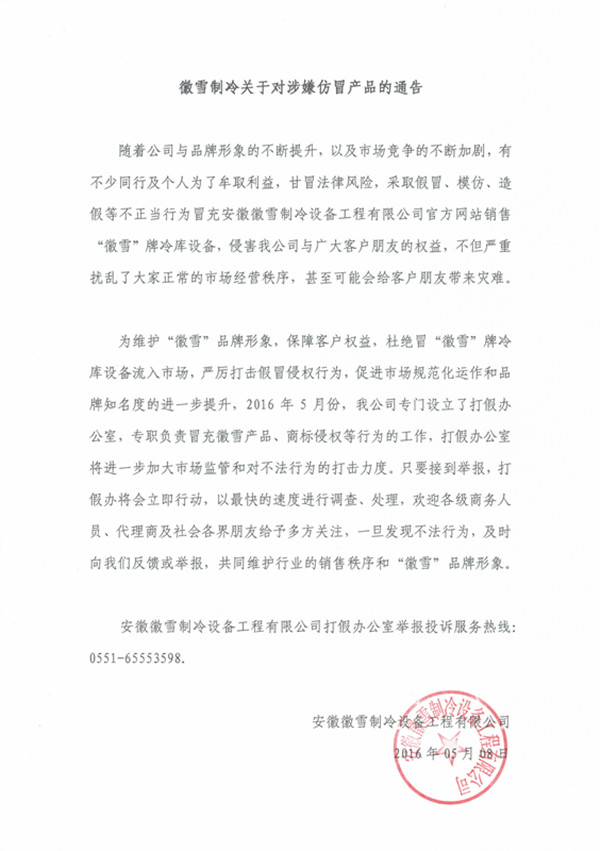 為維護(hù)“徽雪”品形象,保障客戶權(quán)益,杜絕冒“徽雪”冷庫設(shè)備流入市場,嚴(yán)厲打擊假冒侵權(quán)行為,促進(jìn)市場規(guī)范化運(yùn)作和品知名度的進(jìn)步提升,2016年5月份,我公司門設(shè)立了打假辦公室,職負(fù)責(zé)冒充徽雪產(chǎn)品、商標(biāo)侵權(quán)等行為的工作,打假辦公室將進(jìn)步加大市場監(jiān)管和對不法行為的打擊力度。只要接到舉報,打假辦將會立即行動,以快的速度進(jìn)行調(diào)查、處理,歡迎各商務(wù)人員、代理商及社會各界朋友給予多方關(guān)注,旦發(fā)現(xiàn)不法行為,及時向我們反饋或舉報,共同維護(hù)行業(yè)的銷售秩序和“徽雪”品形象。